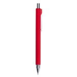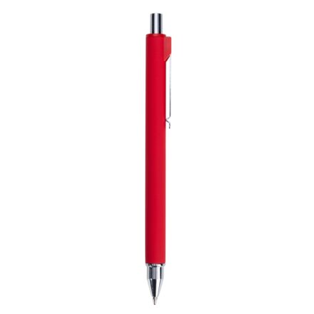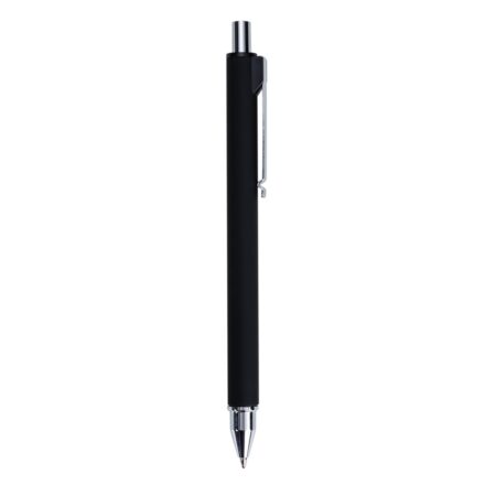 Caneta com revestimento emborrachado e detalhes em prata, aciona por clique.
