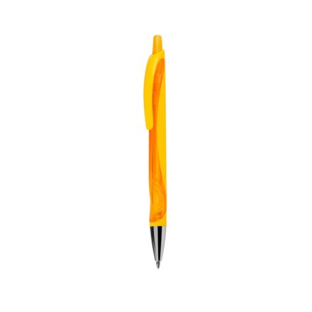 Caneta plástica colorida com detalhe translúcido. Aciona por clique.