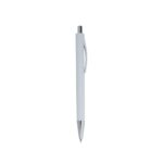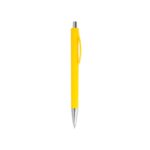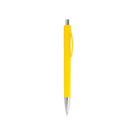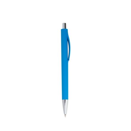 Caneta plástica colorida com detalhes prata. Aciona por clique.
