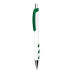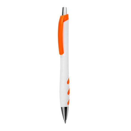 Caneta plástica branca com detalhes coloridos, acionador prata e emborrachado na parte inferior. Aciona por clique.