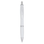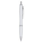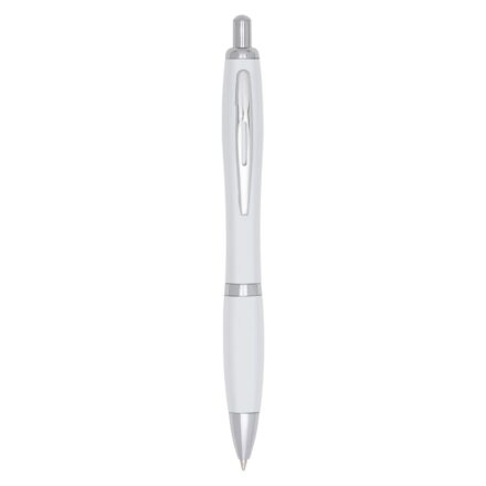 Caneta plástica branca com anel, detalhes em prata e clipe de metal. Aciona por clique.