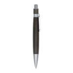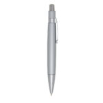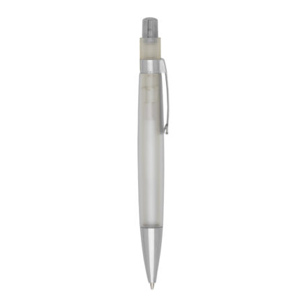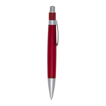 Caneta plástica fosca inteira colorida com detalhes prata, possui relevo abaixo do acionador e clipe de metal. Aciona por clique.