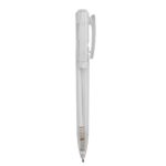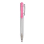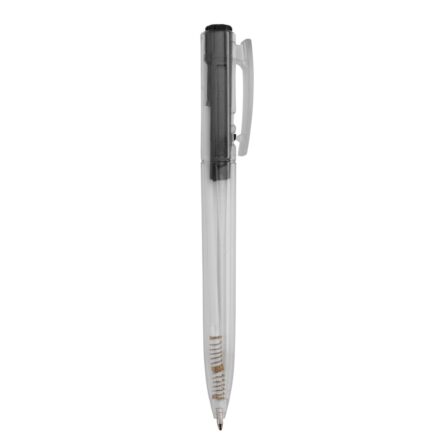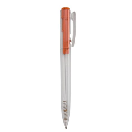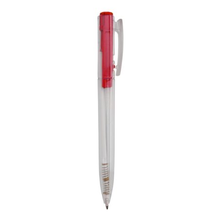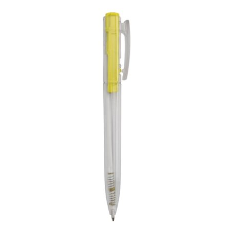 Caneta plástica transparente com detalhes coloridos e anel central em relevo. Aciona por clique e para destravar basta apertar a parte inferior do clipe.