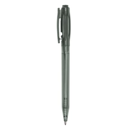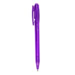 Caneta plástica inteira colorida com detalhes em relevo ao redor do clipe e na parte inferior. Aciona por clique.