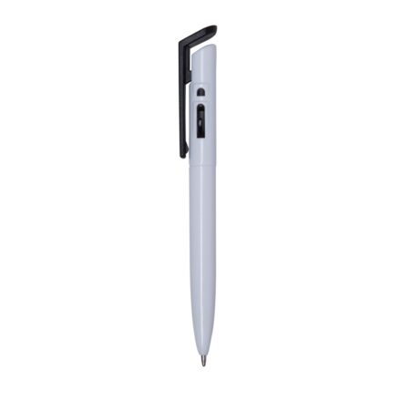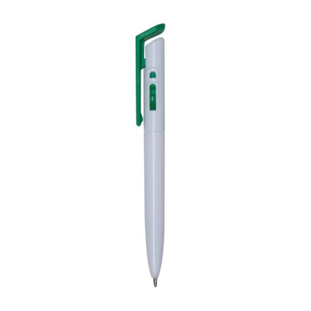 Caneta plástica branca com detalhes no acionador e destravador colorido. Aciona por clique.