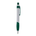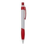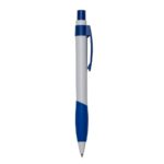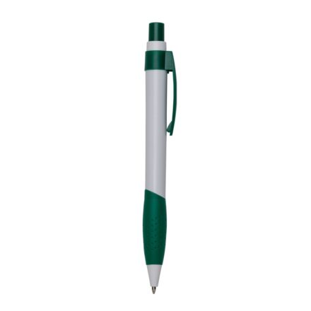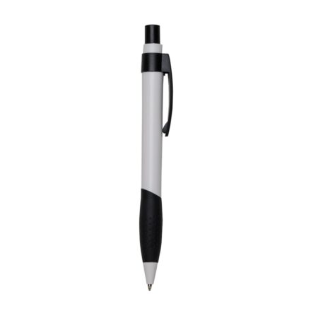 Caneta plástica com detalhes coloridos e em relevo, clipe plástico e parte inferior emborrachada. Aciona por clique.