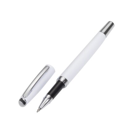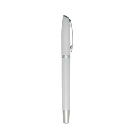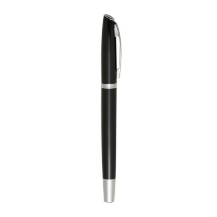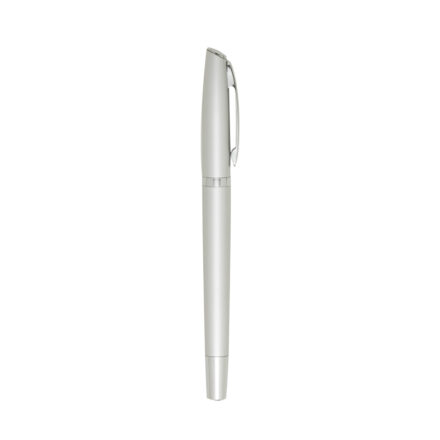 Caneta metal roller com tampa, clipe em metal e detalhes em prata.