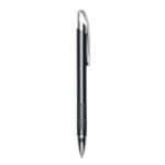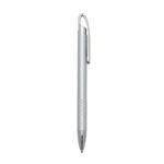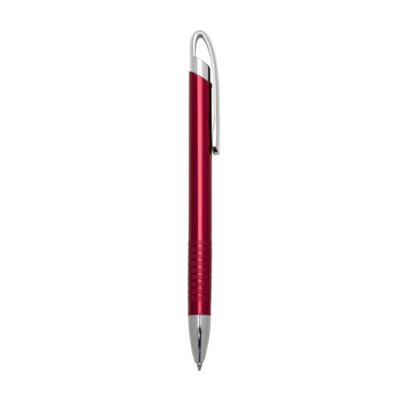 Caneta semi-metal colorida com detalhes prata, clipe em metal e anéis inferiores em relevo colorido. Aciona por clique.