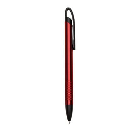 Caneta semi-metal colorida com detalhes em preto, clipe plástico e parte inferior com nove anéis texturizados. Aciona por clique.