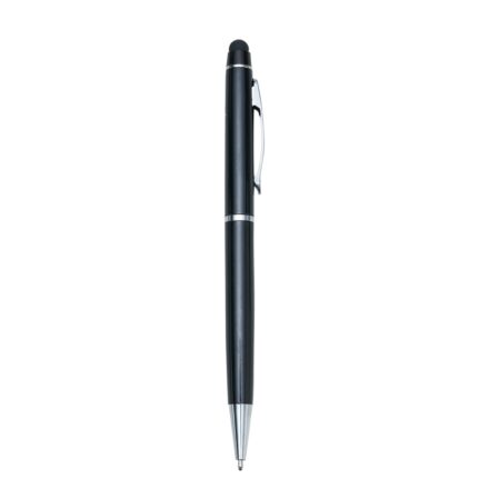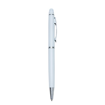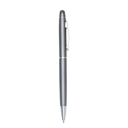 Caneta semi-metal colorida com detalhes em prata, clipe metálico e parte superior com borracha touch. Aciona por giro.